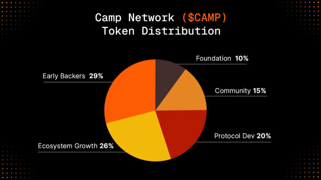Запуск состоялся сравнительно недавно, в конце августа 2025 года, и для обеспечения безопасности и монетизации сети доступно 10 миллиардов токенов CAMP, из которых в обращении находятся 2,1 миллиарда. Наибольшее количество токенов — 29% — принадлежит ранним спонсорам.